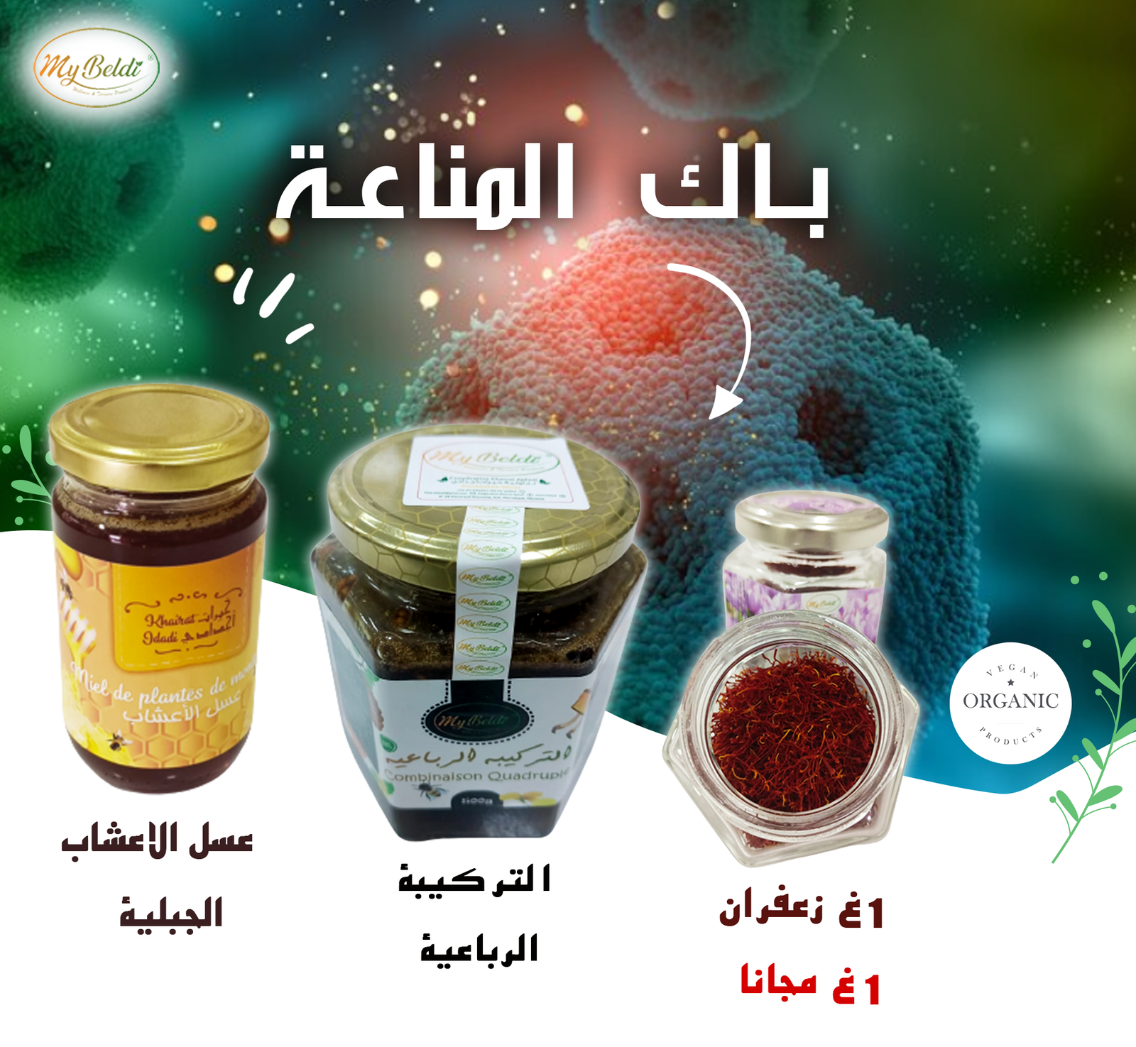 Un mélange exceptionnel de miel pur à base de plantes et de safran gratuit, plus une formule quadruple unique de propolis, de pollen et de gelée royale