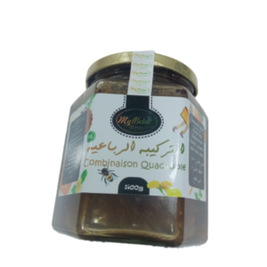 La formule quadruple ou le mélange royal traite de nombreux maux consistant en du miel de haute qualité de votre choix, des abeilles gratuites + propolis ou propolis + déjeuner d’abeille reine + pollen.